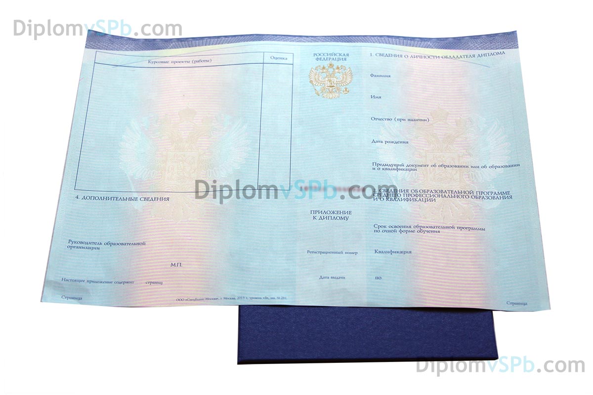 Ищите, где купить диплом нового образца в Санкт-Петербурге? Перелагаем Вам свои услуги. Диплом будет выполнен на настоящем бланке Гознак с учетом всех образовательных стандартов и требований к заполнению современных документов. В дипломе нового образца будет указаны Ваши персональные данные, сведения об образовательном учреждении, все дисциплины, предусмотренные при обучении по выбранной специальности с расчасовками и оценками, все курсовые, практики и выпускная квалификационная работа. Заверяется документ нужными подписями и оригинальной гербовой печатью учебного заведения, оттиск которой выполнен специальными чернилами («мокрая» печать).
